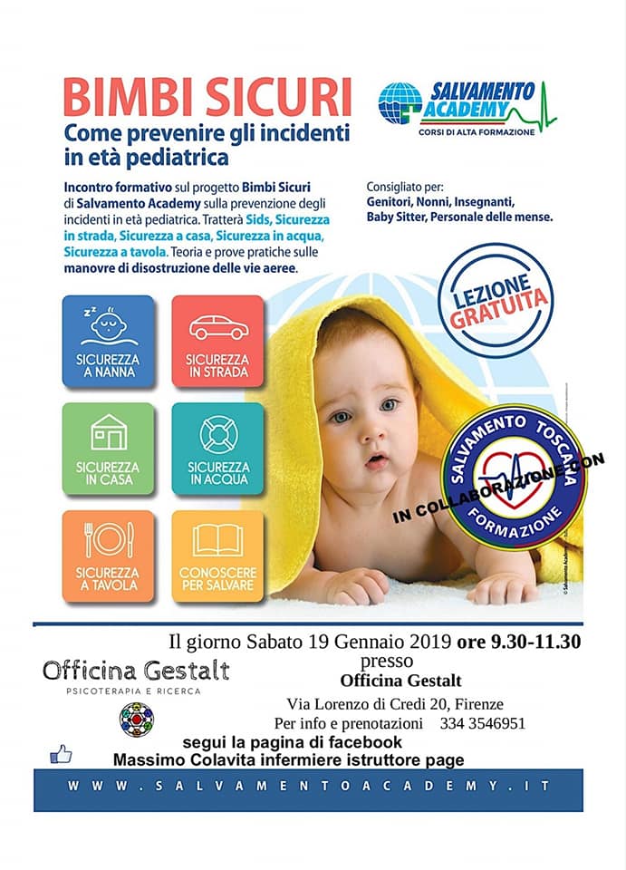 Il 19 gennaio si è svolto l’incontro formativo “Bimbi sicuri”, organizzato in collaborazione con Salvamento Academy e Salvamento Toscana e gli istruttori Massimo Colavita e Stefano Giannaccari. Si è trattato di un incontro gratuito volto a fornire tutte quelle informazioni utili per prevenire gli incidenti in età pediatrica: sicurezza a casa, durante la nanna, in acqua, in macchina, a tavola. E’ stato, inoltre, possibile imparare, attraverso la pratica, le manovre di disostruzione, sia quelle adatte ai bambini fino ai 12 mesi sia la manovra di Heimlich (dai 12 mesi in su). Viste le numerose richieste di partecipare, l’incontro verrà replicato al più presto. Grazie a tutti quelli che hanno deciso di esserci perchè è grazie alla conoscenza che possiamo migliorare la qualità della nostra vita e soprattutto di quella dei nostri bambini!